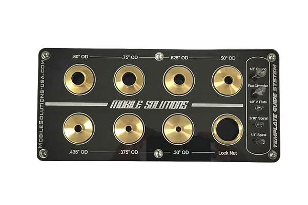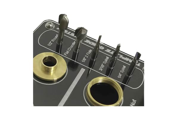 Introducing the new Template Guide System! Use the Template Guide System with a router to machine grooves into a work piece with various router bit profiles and various size router bushings. These bushings and bits can be used WITH OR WITHOUT the Smart Ruler & Smart Ruler XL. Without the smart ruler you can simply stick a single template to a work piece and use the edge of the template as a guide to cut a groove. The included router bits are used for adding accent cuts or for material compensation (Example: vinyl to carpet transitions)